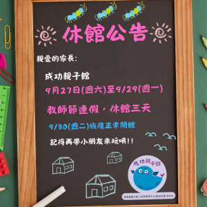 親愛的家長您好,成功親子館自9/27(週六)至9/29(週一 ...