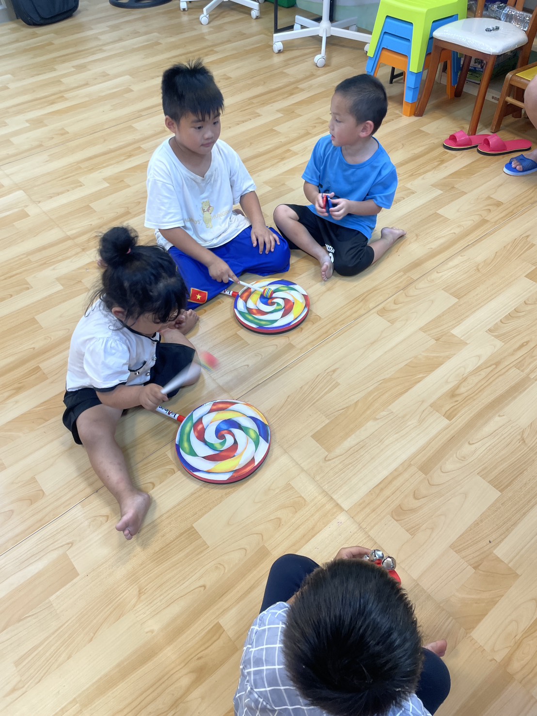 最讓孩子們驚喜的,是「雨聲筒」,當細沙在竹筒中流動,孩子說:「像下雨、像河流、像石頭沙子碰撞的聲音」,讓每個孩子都靜靜傾聽,讚嘆不已:「好療癒喔!」