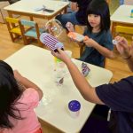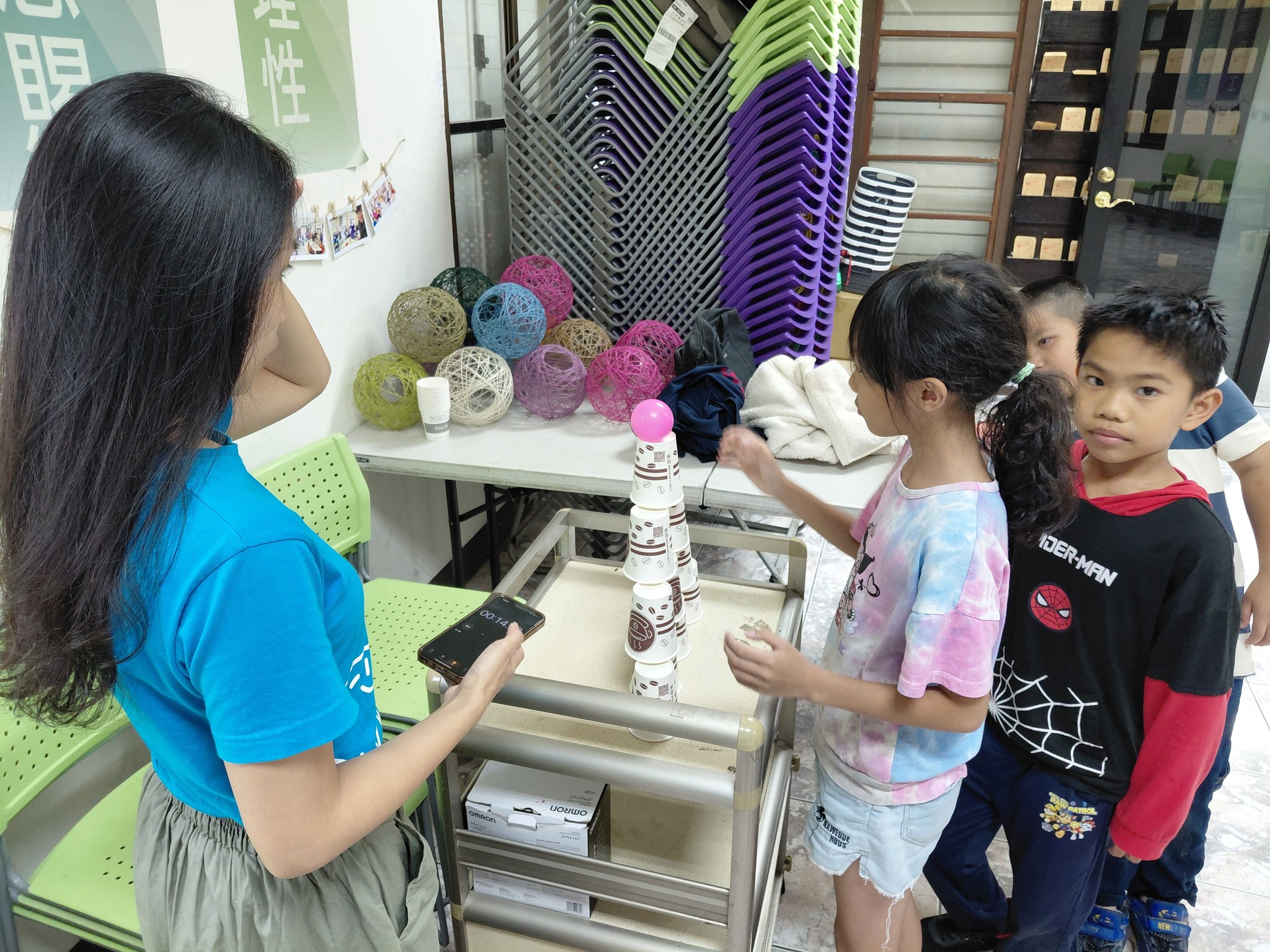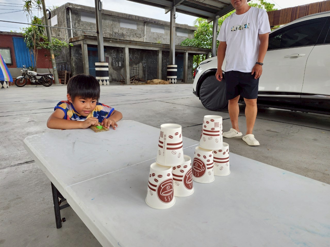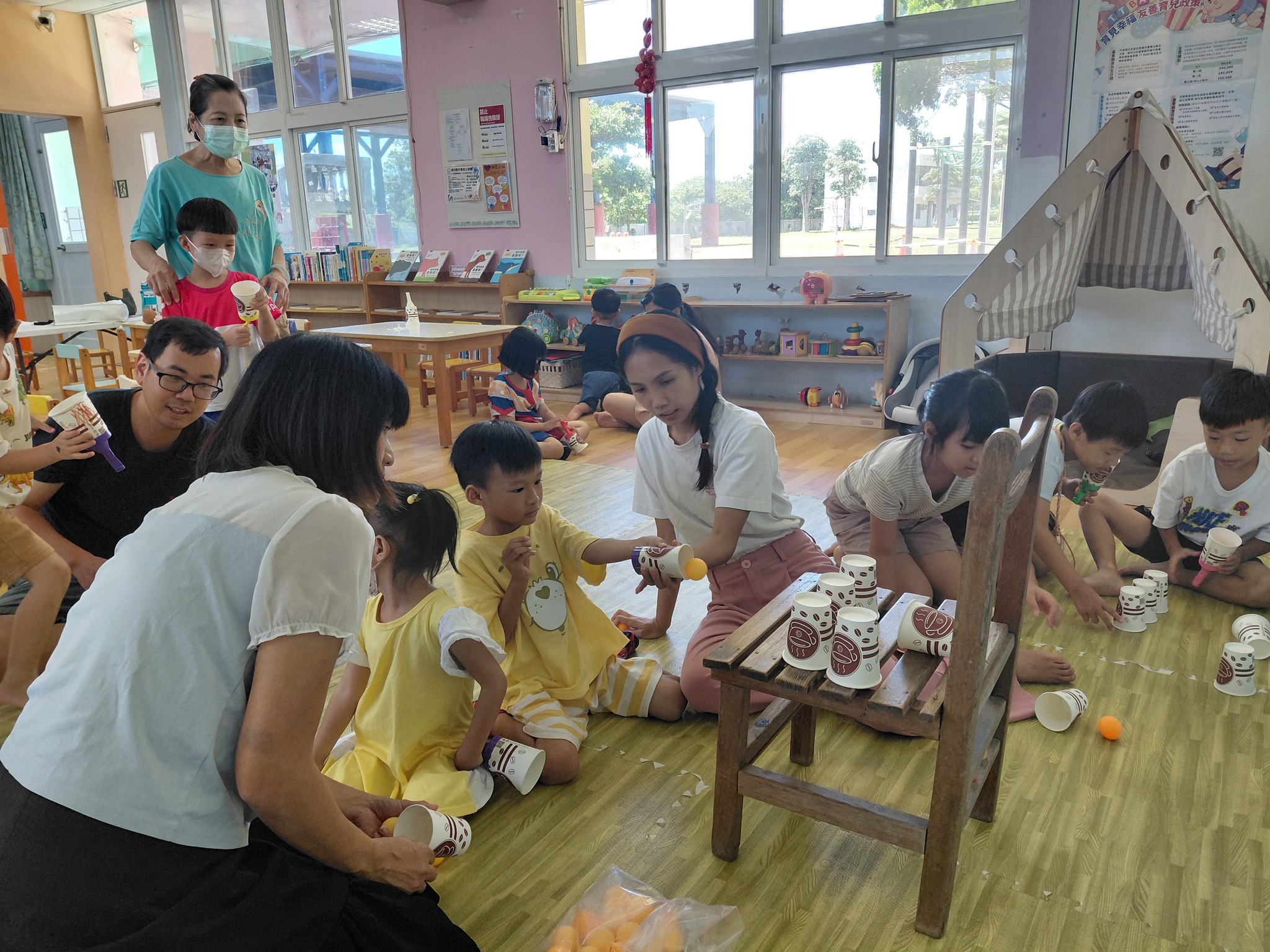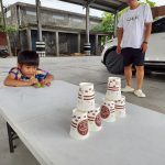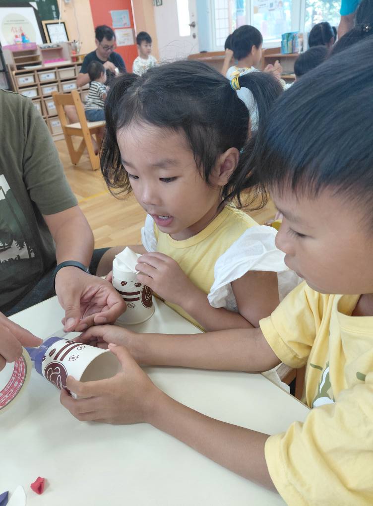 最受小朋友喜愛的,還有老師親手製作的「瓶蓋發射器」。只見小男孩們全神貫注,裝上瓶蓋,瞄準高高堆起的杯杯金字塔,「砰!」的一聲,杯子紛紛倒下,現場響起一陣掌聲與歡呼。孩子們一玩再玩,完全沉浸在挑戰與成就的快樂中。
