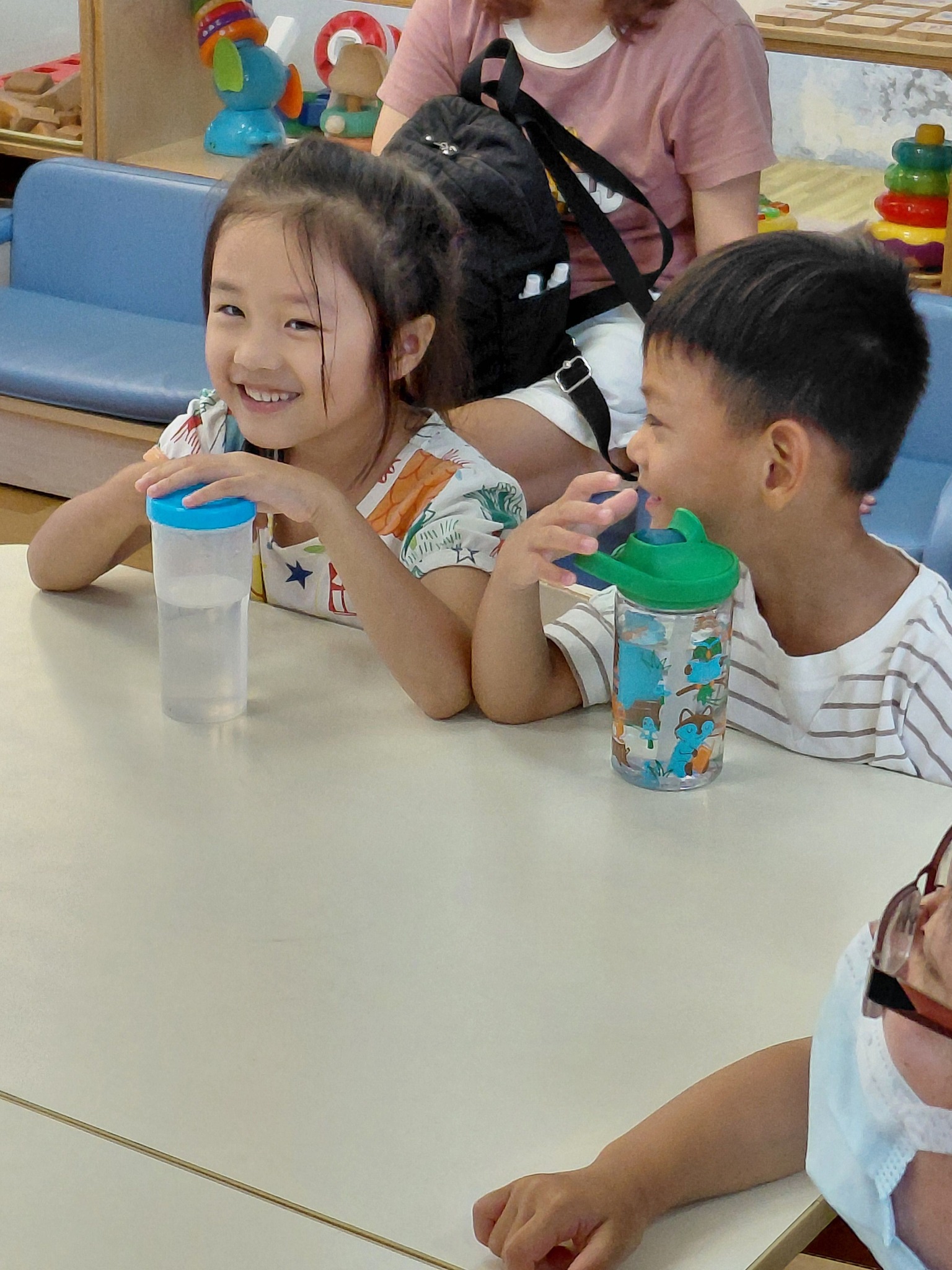 孩子們一走進場,就馬上被各種桌遊吸引目光:有考驗平衡的《諾亞方舟》、色彩繽紛的《七彩磁力拼板》、閃閃發亮的《彩色寶石板》,以及挑戰記憶力的《顏色翻翻樂》。遊戲桌前不時傳來的笑聲,還有幼兒專注又快樂的神情,讓家長們也忍不住跟著微笑。