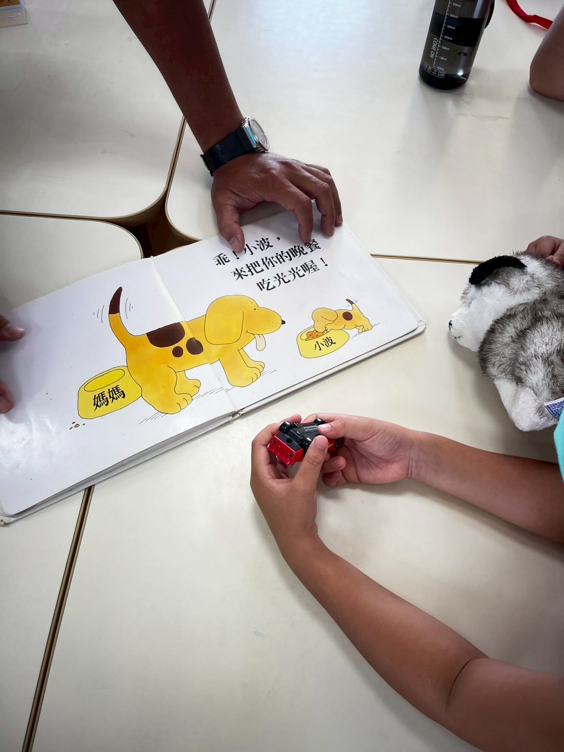 除了自然知識的學習,活動更著重於親職互動技巧的培養。家長可以透過遊戲式閱讀,讓孩子們更專注於故事,也更容易理解抽象的自然科學概念。小天老師也示範了如何運用日常簡單的材料,把繪本裡的情境轉化成小遊戲,讓家庭閱讀增添更多樂趣。