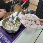 在魚丸製作過程中,家庭們選擇自己喜歡的配料進行調味,接著進入捏製環節。戴上手套後,大家紛紛擺出「OK」的手勢,用虎口的力道擠出一顆顆可愛的魚漿球,再用湯匙輕輕舀入熱湯中。隨著魚丸浮出水面,現場充滿了期待與驚喜的笑聲。講師還分享小秘訣,例如湯匙要先沾水避免沾黏、魚丸不宜太大顆以免不易熟、煮熟後冰鎮能讓口感更Q彈等實用技巧,讓大家收穫滿滿,增進親職技能。