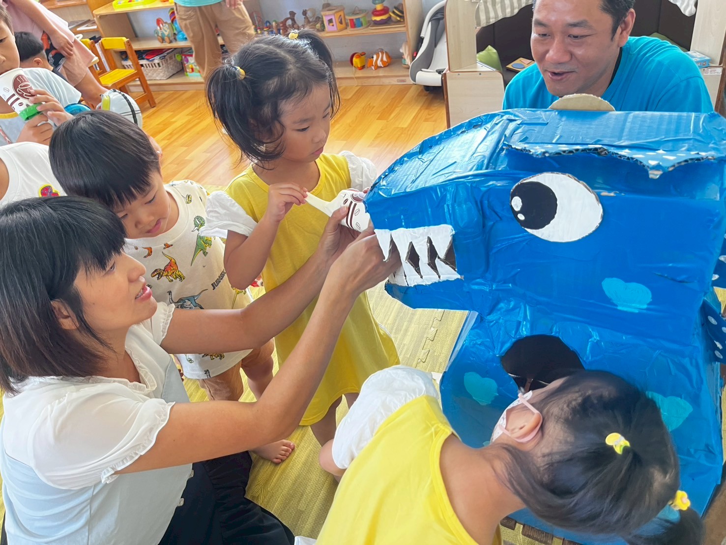 DIY製作完成後,小朋友們迫不及待地拿著紙杯空氣炮進入遊戲環節。首先是「繫倒金字塔」練習賽,孩子們全神貫注、用力一拉,將乒乓球射出,紙杯金字塔瞬間倒塌,贏得小朋友開心的笑聲。隨後進入壓軸的「恐龍吃藥藥」單元,特製的恐龍模型張大嘴巴等著餵食,小朋友需要將「藥藥球球」精準打入恐龍嘴裡,完成餵藥球的挑戰。這個遊戲不僅趣味十足,也讓孩子在遊戲中學習手眼協調與專注力。