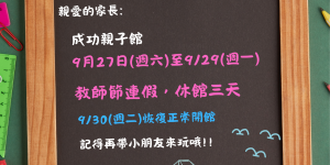 親愛的家長您好,成功親子館自9/27(週六)至9/29(週一 …