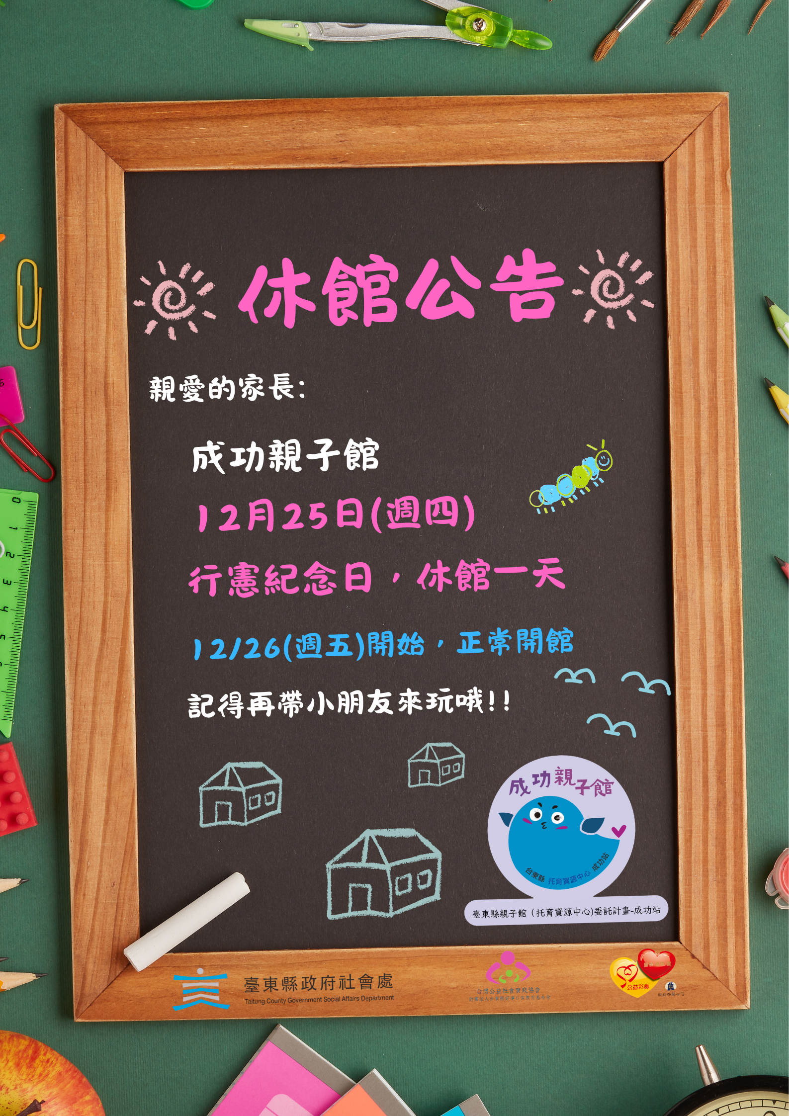 【成功親子館|休館公告】 發佈日期: 2025 年 12 月 24 日2025 年 12 月 24 日 作者: 林 國大 親愛的家長,12月25日(週四)為國定假日-行憲紀念日成功親子館休館一天,可以帶著小朋友去戶外走走一起渡過開心的一天哦!!#台東縣親子館托育資源中心成功站#成功親子館#0至6歲孩子及家長或照顧者優先報名#共學共玩共融#主辦單位台東縣政府社會處#承辦單位台灣公益社會實踐協會#台東縣公益彩券基金補助#大福小編