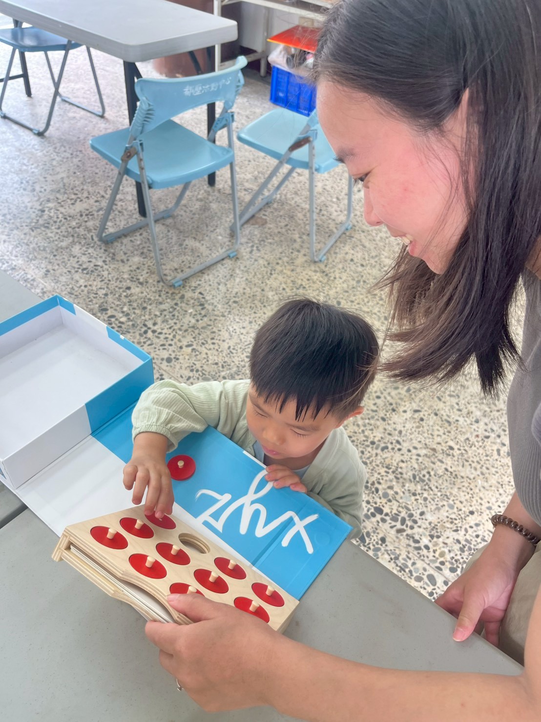 家長在一旁輕輕跟著哼歌,用自己的方式陪伴、參與。