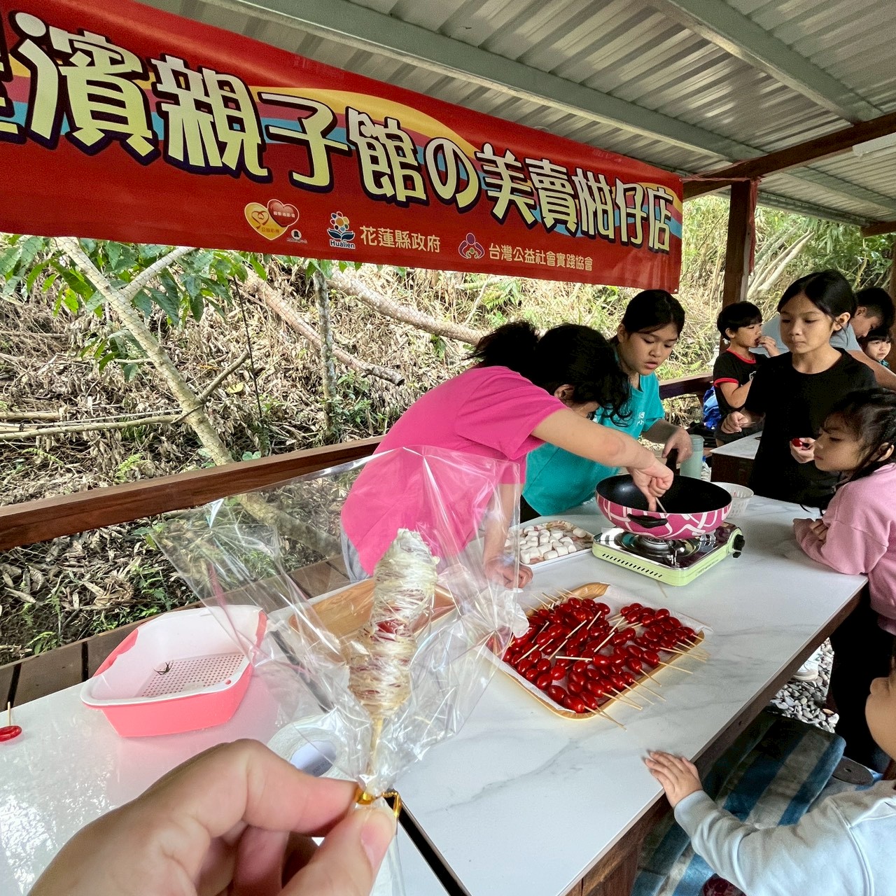 親子一起動手串水果、裹糖衣,